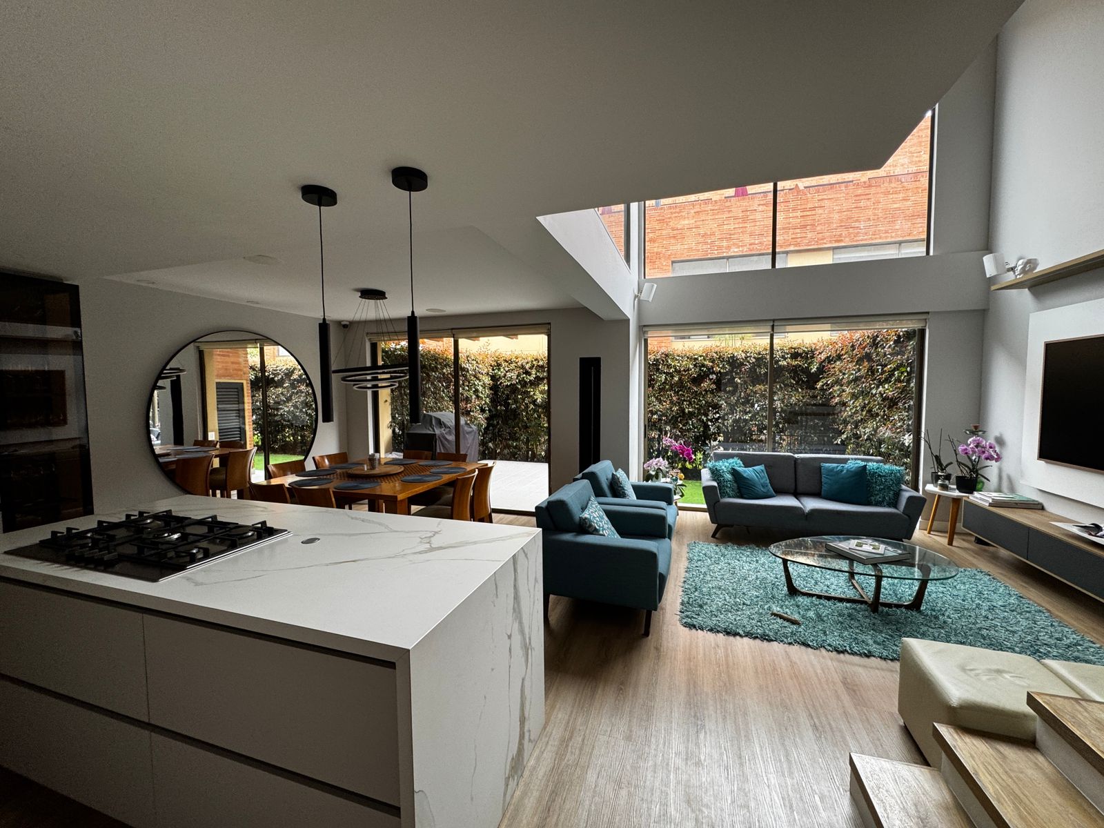 Primer nivel: amplia zona social, zona BBQ, jardín, cuarto de servicio con baño.